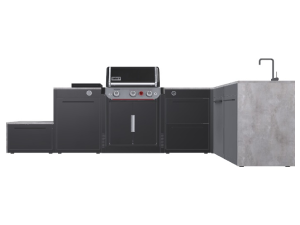 La cuina modular combina disseny, resistència i confort gràcies als cinc mòduls i un altre de central amb barbacoa WEBER GENESIS de tres cremadors. Incorpora també un cremador lateral per cuinar amb total versatilitat.