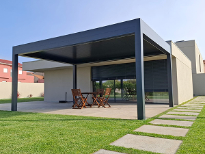 Pèrgola bioclimàtica XL, amb panells orientables i llums LED incorporades. Dissenyada per assolir, en condicions extremes, fins a 7×5 m. Compatible amb elements verticals de tancament, com la corredissa de vidre, un sistema de tancament vertical totalment translúcid amb diverses possibilitats de tancament i múltiples fulles, totalment personalitzable.