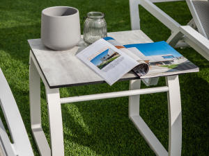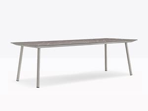 La taula d’exterior Babila compta amb potes de tub d’acer de Ø50 mm combinades amb un sobre d’exterior quadrat, rodó o rectangular, recolzat sobre un marc d’alumini extrusionat.