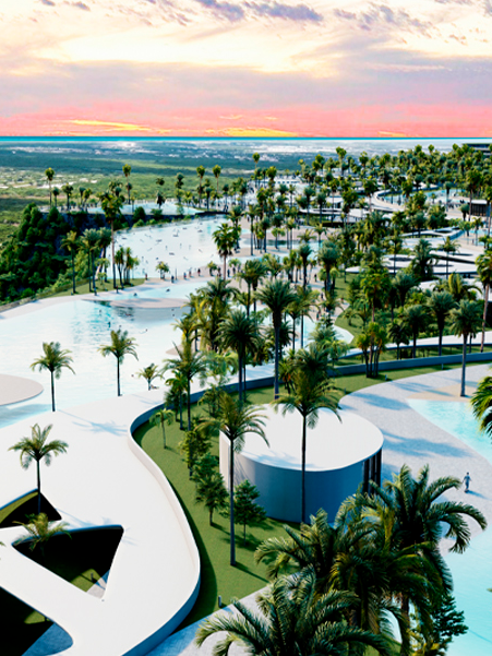 A lo largo de este eje vertebrador se distribuyen algunos de los amenities más destacados de la primera fase, entre ellos el Beauty & Wellness Center y el Beach Club con playas artificiales, concebidos para ofrecer experiencias únicas de salud, descanso y vitalidad. Estos espacios no son elementos aislados, sino parte de un diseño urbano integral donde cada detalle busca mejorar la calidad de vida de los residentes.